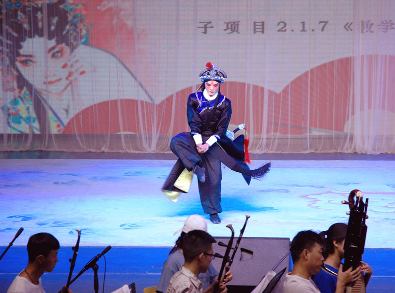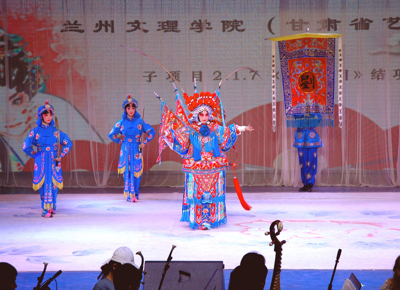 本次项目以昆曲《林冲夜奔》、京剧《盗御马》和京剧《女杀四门》为主要内容,直接受训学生20余人、教师9人,分花脸、武旦、武生三种行当,主要学习京剧、昆曲的剧目唱念做打的技术规范,并成功移植为秦腔进行汇报,时间短、任务重、工作量大、技术要求高。我校教师和学生不负众望,完成了全部学习内容并成功搬上舞台,汇报圆满成功!