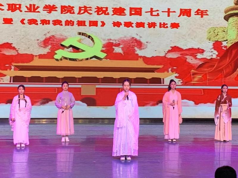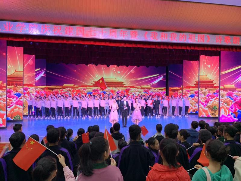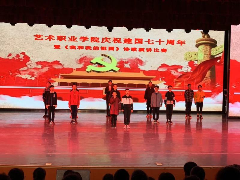 为进一步加强爱国主义教育, 在庆祝中华人民共和国成立70周年之际,2019年10月23日晚yl9193永利集团在实验剧场举行了《我和我的祖国》诗歌朗诵比赛。本次活动由学生科、分团委的组织,学院党总支书记陈毕栋、副院长张全红、学生科长赵鉴、教务科长张东升、分团委书记李斌、音乐教研室主任王艳丽、舞蹈教研室主任王娟和全体学生参加。