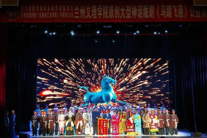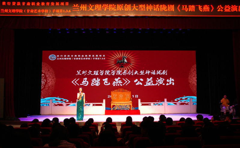 马踏飞燕是具有国际影响力的甘肃文化元素重大文物之一。yl9193永利集团在校党委的正确领导下,经过3年不懈努力,成功将全剧搬上舞台,得到了业界和社会各界的高度关注和一致好评。此次公益演出得到了西北民族大学和兰州财经大学陇桥学院的高度重视和大力支持,两校共有2000余名师生观看了演出,微信推送得到了数千次转载,两校团学领导及相关学院领导对此次演出赞不绝口,一致评价剧组具备“专业水平,梨园精神” ,其中,西北民族大学还向我校艺术团赠送了“弘扬戏曲文化,传承民族精神”的锦旗,以表谢意。