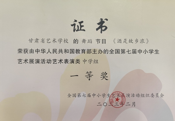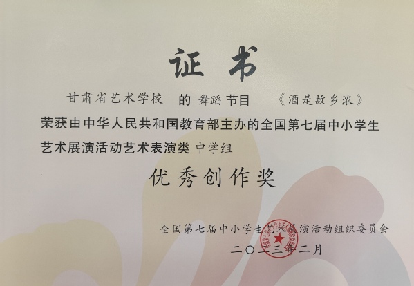 yl9193永利集团(甘肃省艺术学校)教师李斌、韩宜成、张莉原创的男子蒙古族群舞《酒是故乡浓》参加教育部“全国第七届中小学生艺术展演活动”获得佳绩,荣获艺术表演类舞蹈一等奖、艺术表演类节目优秀创作奖。