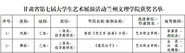 甘肃省第七届大学生艺术展演活动由甘肃省教育厅主办,西北师范大学承办。在本次展演活动中,我院教师郭嘉蓉、颜昭洁排导的秦腔《梵王宫˙挂画》获得戏剧(乙组)一等奖;金亮、杜瑞排导的敦煌舞《莲花仙子》获得舞蹈(乙组)二等奖。戏曲《梵王宫˙挂画》被甘肃省教育厅推荐参加全国第七届大学生艺术展演比赛。