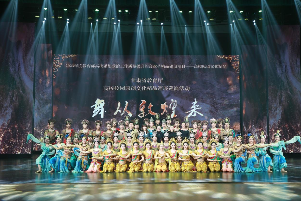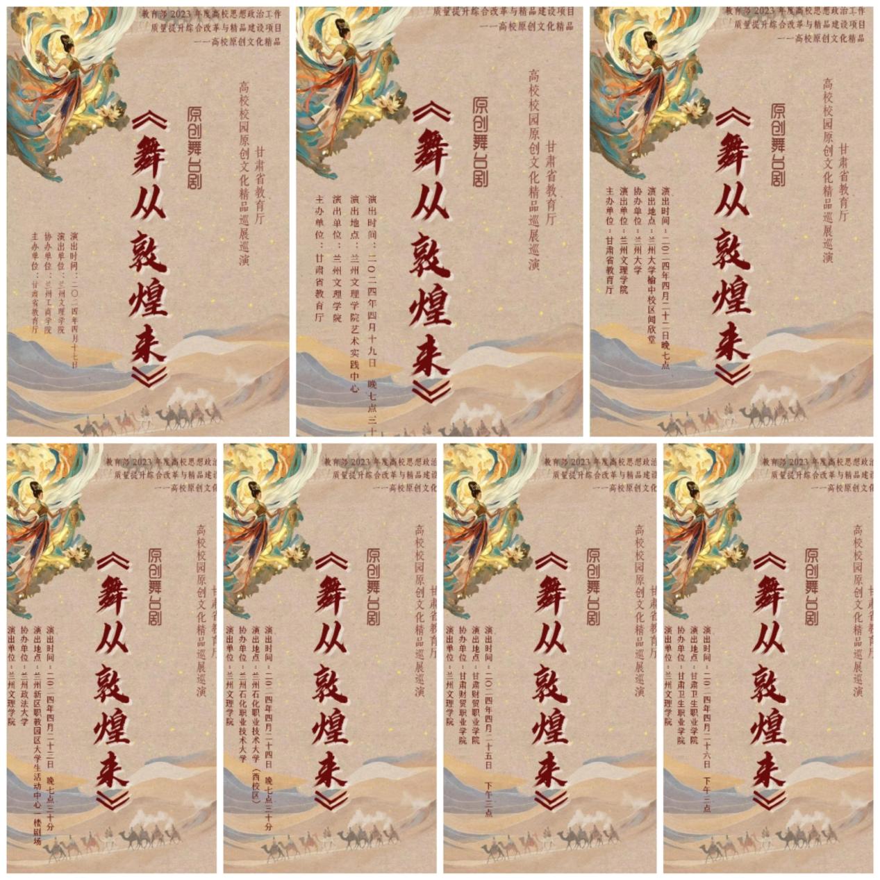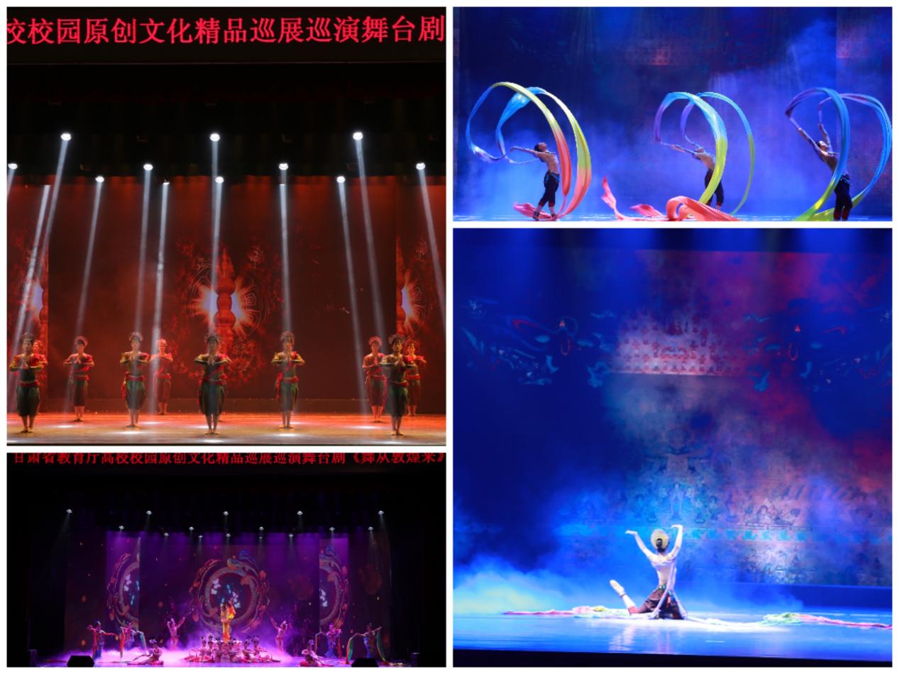 为推动各高校深入落实“时代新人铸魂工程”,根据《教育部办公厅关于开展高校校园原创文化精品巡展巡演的通知》精神和省教育厅安排,2024年4月17日—4月26日永利官网原创舞台剧《舞从敦煌来》分别在兰州工商学院、永利官网、兰州大学、兰州政法大学、兰州石化职业技术大学、甘肃财贸职业学院、甘肃卫生职业学院等七所高校展演。
