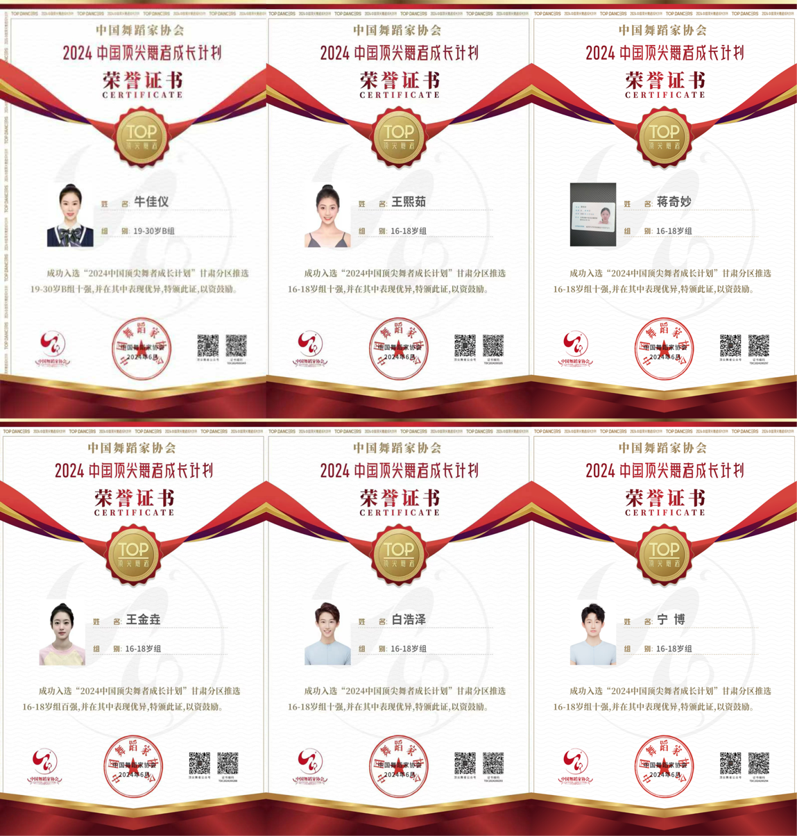 yl9193永利集团(甘肃省艺术学校),舞蹈表演(敦煌舞方向)本科学生牛佳仪、王熙茹;中职学生王金垚、蒋奇妙、杨雨婷、白浩泽、宁博在中国舞蹈家协会主办的“中国顶尖舞者成长计划”活动“2024中国顶尖舞者奖”中表现卓越,取得甘肃前十的好成绩,并成功晋级至全国赛事。