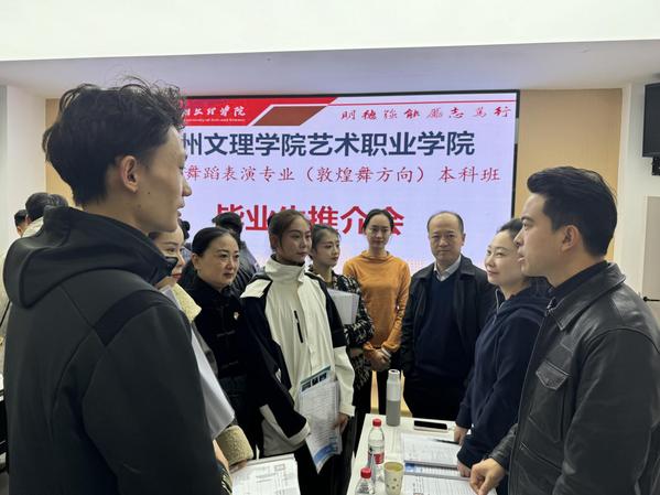 副院长金亮介绍了毕业生的整体情况,党总支书记王宏勉励学生要认清就业形势、放平就业心态积极转变就业观念,珍惜每个就业机会。来自甘肃省歌剧团、甘肃省民族歌舞团、陕西省歌舞剧院等多家艺术团体与毕业生进行了洽谈、沟通、交流,为毕业生提供优质的工作机会,打造院校共育平台,共同推动我院就业工作落地做实。