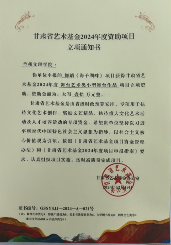 20241219日,甘肃省文化和旅游厅公布了甘肃省艺术基金2024年度资助项目名单,我院教师潘扬弘一原创舞蹈作品《海子湖畔》成功获批甘肃省艺术基金立项。
