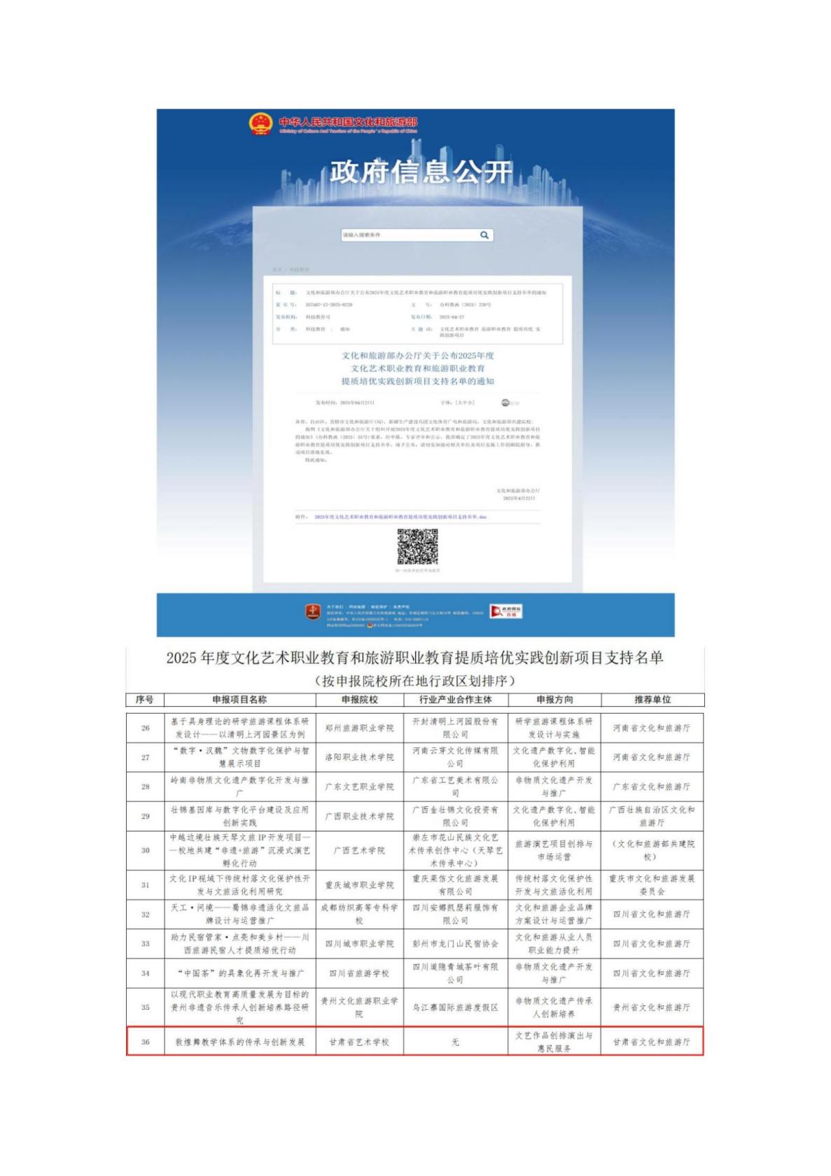 按照《文化和旅游部办公厅关于组织开展2025年度文化艺术职业教育和旅游职业教育提质培优实践创新项目的通知》要求,我院《敦煌舞教学体系的传承与创新发展》(项目负责人:金亮)成功入选文化和旅游部2025年度文化艺术职业教育和旅游职业教育提质培优实践创新项目,是甘肃省唯一获此项目的中职院校。此项目旨在通过敦煌舞教学体系的传承发展,深化产教融合、提升学生的实践能力培养,逐步攀登敦煌舞人才培养制高点,助力文化强国建设。